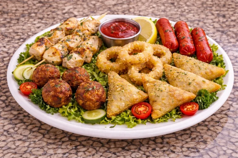 X3 Polpette, X3 Spiedini di Pollo, X3 Viennas, X3 Samoosas, X3 Anelli di Calamari Fritti e Impanati, serviti con un contorno a scelta