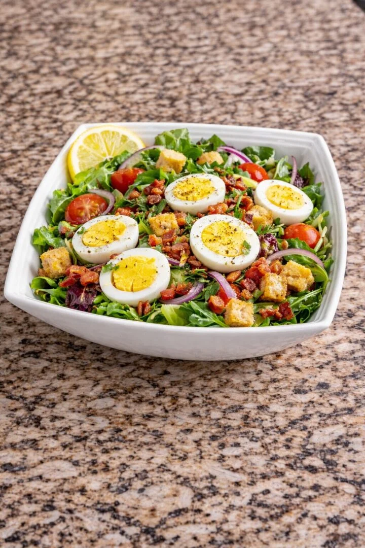 Delizioso letto di lattuga fresca con uova sode, crostini, bocconcini di pancetta croccante, pomodori e cipolla rossa